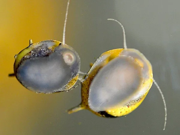 Voeding van het gewei slak zwart/geel (Clithon sp.)