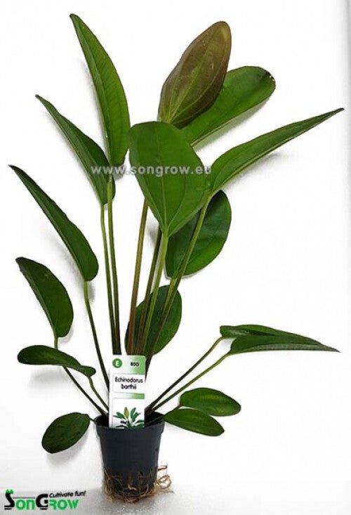 Een hele mooie Echinodorus die er krachtig uitziet. De plant heeft mooie roodbruine bladeren die groener worden naarmate ze ouder worden en dan ook een iets andere vorm krijgen. Wat vooral mooi is aan de bladeren is dat ze mooie lichtgroene nerven in het blad krijgen. Het is een gemakkelijke plant die zowel hard als zacht water verdraagt. Hij heeft wel veel licht nodig en redelijk wat voeding. Het is geen overheersende plant. Hij woekert niet. Hij wordt snel en gemakkelijk 25 cm hoog en lekker breed, maar daarna blijft hij ook lang zo. Dat maakt hem erg geschikt als solitaire plant.