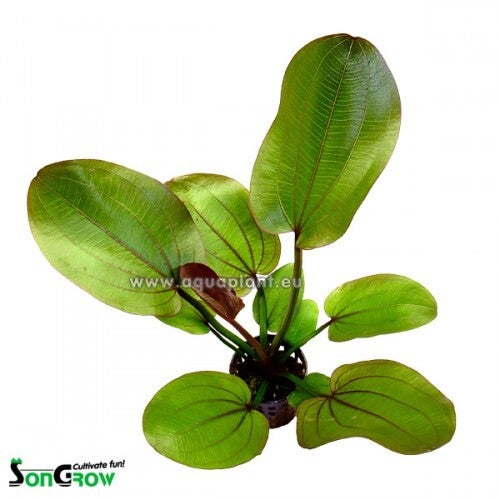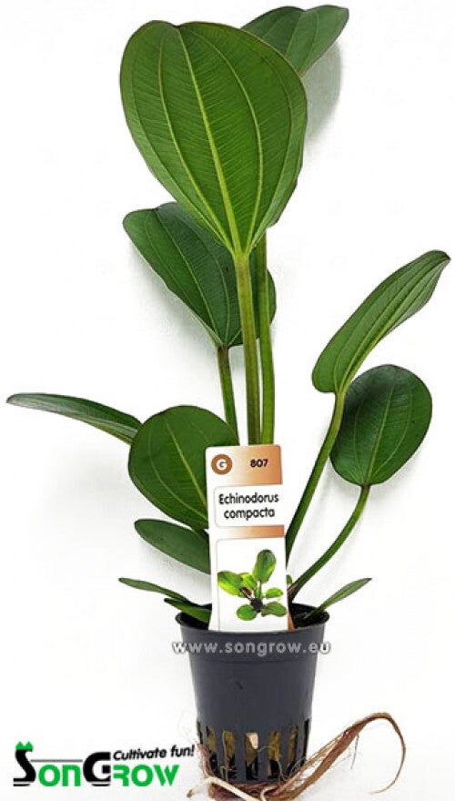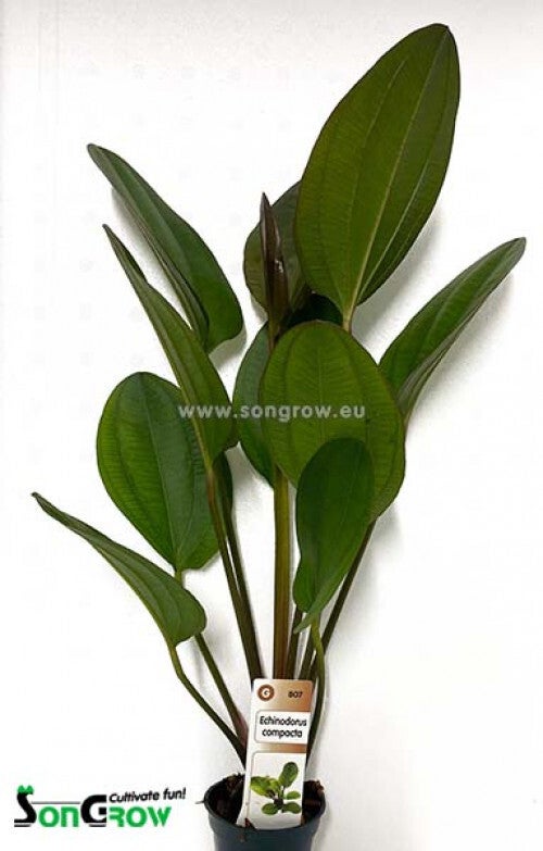 "Een bijzondere echinodorus waarvan de naam het al aangeeft. Hij is compact. Dat betekent voor deze plant dat hij eigenlijk een maximale hoogte heeft van 40 cm waarbij de nieuwe bladeren wel steeds erbij komen in een langzaam tempo maar steeds weer tot aan de bovenkant. De plant wordt dus zeer langzaam groter. Zijn kleur is heel bijzonder donkergroen van het oude blad tot superrood van het nieuwe blad. Bladvorm is net als een een grote aardappelopscheplepel en zeer getekend. Het is ook erg mooi een paar kleine compacta's bij elkaar te zetten!"