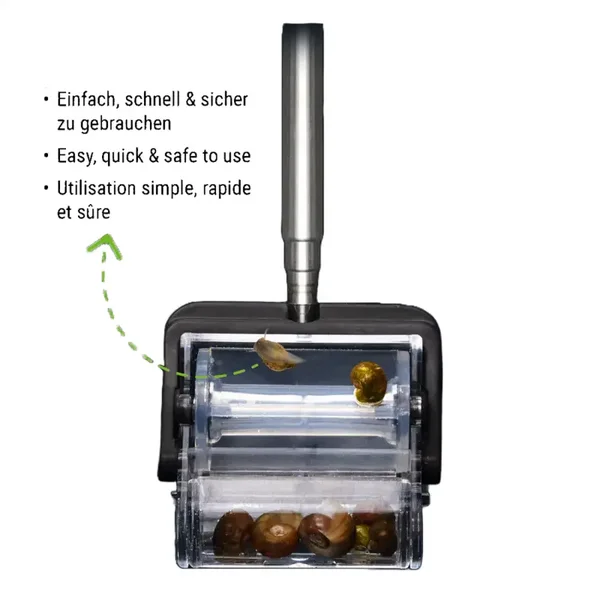 Om ongewenste slakken te verwijderen, trek je simpelweg de slakkenvanger langs de aquariumraam en vervoer je de slakken (maximaal 6 mm groot) door de roller naar de vangcontainer.