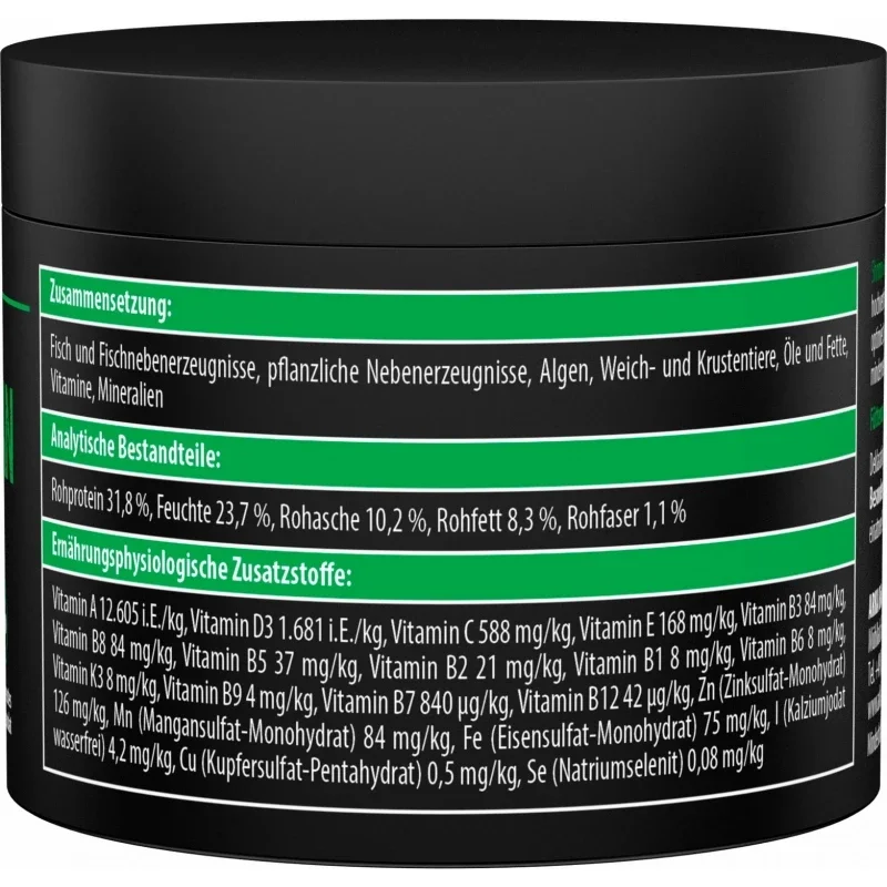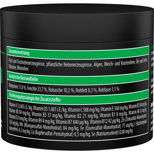 Compositie: Vis en visbijproducten, plantaardige bijproducten, algen, weekdieren en kreeftachtigen, oliën en vetten, mineralen, vitamines